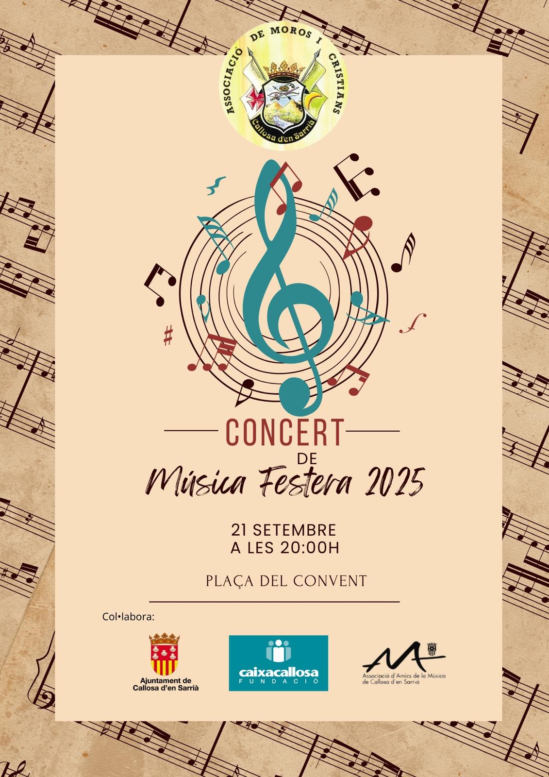 - Concert de Música Festera 2024La Banda de Música «La Primitiva» de l’Associació d’Amics de la Música de Callosa d’en Sarrià ens ofereix el 22 de setembre de 2024, a les 20:00h en la Plaça del Convent, el tradicional concert de Música Festera. Este concert és el preàmbul de la vespra festera, conformada per l’Aurora, el Roser i finalment els quatre dies de Moros i… Lee más: Concert de Música Festera 2024